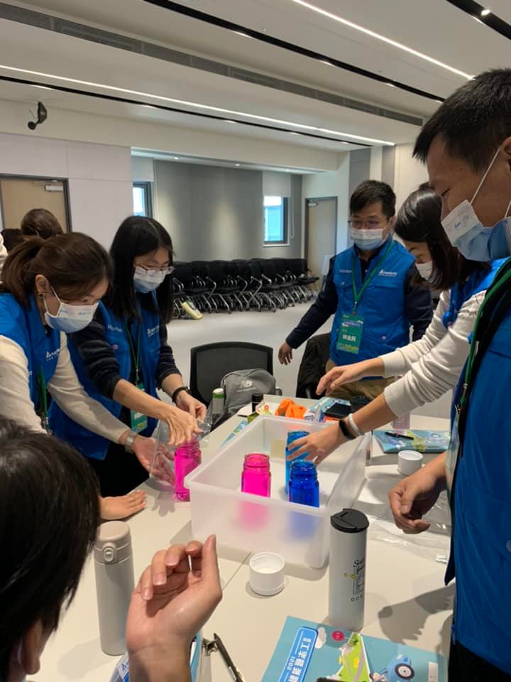 為了瞭解電動載具的發展趨勢,課程第一日安排參觀中壢五廠五十周年展覽和電動車展間,透過事業單位同仁解說電動車發展趨勢和零組件,感受技術突發猛進;最受歡迎的莫過於從科學原理探究氣候變遷以及能源實驗操作,從而反省人類行為對於環境的影響,今年為了呈現氣候變遷和空氣汙染的聯動關係,課程從NASA提供的本世紀全球空氣品質變化為素材,以實例探討隨人類行為而來的高碳排,在全球主要都市都加重了霾害現象和熱島效應,其中逆溫層扮演關鍵角色;為了讓志工們在小學課堂上,介紹空氣對流空氣的正常原理現象,如何被逆溫層擾亂而喪失功能,志工們學習透過冷熱水對流實作,透過不同溫度水流帶出的色彩變化,創造宛如魔術般的效果。