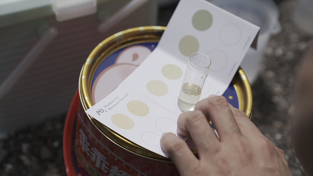 整理完周邊環境後,台達志工便開始進行每次育苗前例行的海水檢測,根據聯合國政府間氣候變化專門委員會(IPCC)最新出版的《第六次氣候變遷評估報告(AR6)》顯示,海洋酸化與缺氧問題將在本世紀持續增加,且其變化是不可逆的。志工透過三至四種試劑,檢測當日的海水酸鹼性與軟硬度,其目的便是確保海水的水質是符合珊瑚的生長條件。