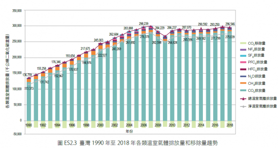 台灣溫室氣體總排放量從1990年的1.3億公噸,持續翻倍成長到2018年的2.9億噸,中間排碳在2008、2009年金融風暴時驟降,接下來10年的降幅皆微不足道。