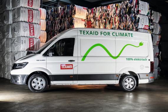 收送舊衣的車體標語:保護氣候、100%電動車(圖片來源:Texaid新聞資料)