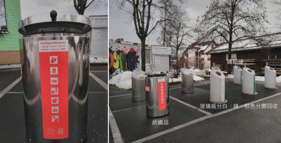 筆者住家附近的回收場。筒狀物是開口,通往地下大型回收箱。紡織品、玻璃、鐵鋁罐由不同回收公司負責。回收筒開口較小可以預防非法傾倒家用垃圾(圖:戴雅婷)