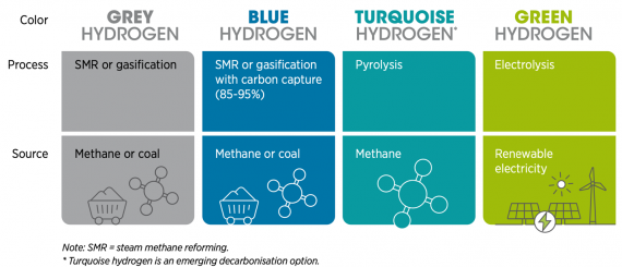 不同顏色氫能的生產過程和來源。圖片來源:IRENA (2020). Green Hydrogen: A Guide to Policy Making.