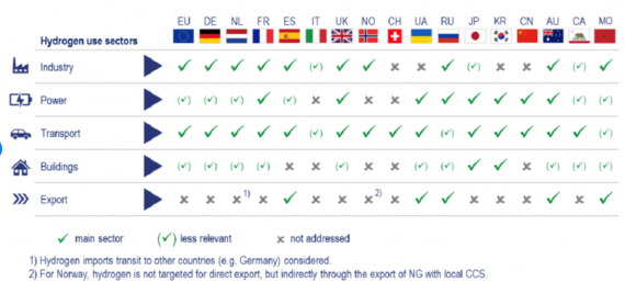 根據World Energy Council的報告(見下圖),目前大部分國家預計將綠色氫能主要運用在交通部門(長程飛行、航運)、產業(鋼鐵、化工等)、能源產業(儲能),而西班牙、烏克蘭、俄羅斯、澳洲和摩洛哥因為再生能源的優勢,則計畫將綠色氫能出口到其他國家。