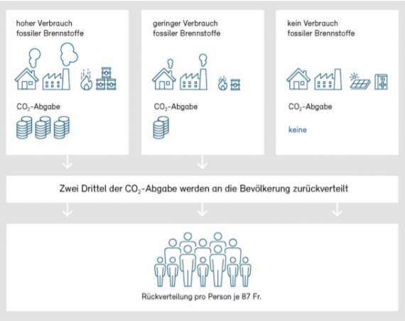依照上述的收費原則,過著低碳生活的家庭不但不需要為了碳排付出額外開銷,反過來還能因此收到錢。瑞士國會多數政黨皆表示同意,並通過修正的《二氧化碳法》。這項修法也受到瑞士經濟聯合會(Economiesuisse)與工商團體的支持(石油進口公司、煉油廠、汽車協會等除外),在民調中也有超過七成的支持率。