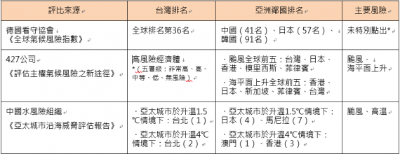 台灣氣候風險在國際評比中明顯高於他國,德國看守協會分析氣候災害對各地區造成的財物損失進行影響評估,指出台灣長期氣候風險排名為全球第36名,比起鄰國中國(41)、日本(57)與韓國(91)來得高。