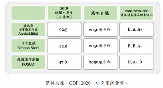 國際重要製鐵業減碳目標與減碳績效分析。資料來源:CDP, 2021,圖表:研究團隊彙整