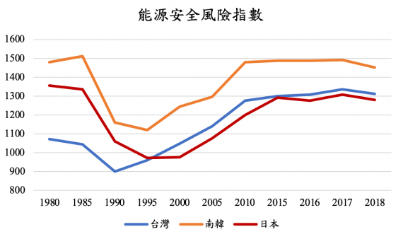 台灣、南韓和日本能源安全風險指數比較。資料來源:Global Energy Institute, 2020