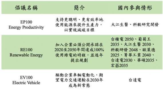 台灣企業參與國際減碳倡議行動。資料來源:研究團隊彙整