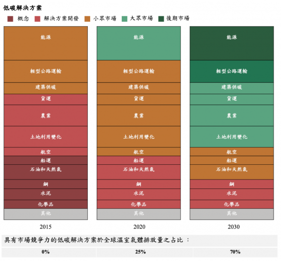 《巴黎協定》簽署後的幾年當中,全球排放量已從2015年的530億噸CO2e上升至550億噸。不過相比五年前,如今低碳商業模式較能與高碳商業解決方案競爭,甚至到2030年,低碳商業解決方案將在占全球排放量70%的行業中具有高競爭力。