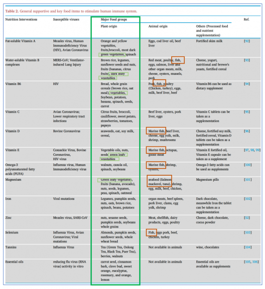 一般營養介入與增強免疫系統的食物來源(綠色部方框為植物性來源),圖片來源:Alam and Bhuiyan, 2021. [2]