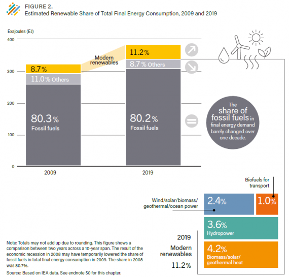 然而,新增的再生能源容量,卻不見化石燃料使用明顯下降。以2019年全球最終能源消費總量(Total Final Energy Consumption, TFEC)來看,再生能源(不包括傳統使用的生物質biomass)在能源消費的占比,較十年前(2009年)只微幅成長約2%,從8.7%增加至11.2%;反觀化石燃料的占比,已連續十年未降,仍高居八成左右,這也彰顯過去十年氣候政策承諾多為空頭支票。報告進一步分析原因,包含全球能源需求的上揚,持續消費與投資化石燃料,此外,發展中國家已逐步減少使用傳統生物質來取暖、烹飪,但大多透過石油、天然氣等化石燃料來滿足其能源需求,都讓再生能源使用成長幅度受到限制。