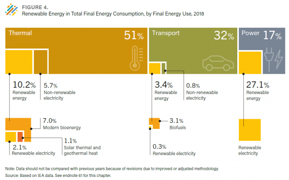 報告進一步剖析,再生能源於終端消費部門的使用情形。過去幾年間,在家電、照明等電力部門(不包含用於供暖製冷與運輸的電力)的再生能源占比已超過四分之一,但電力僅占全球最終能源消費總量的17%。然而,占全球最終能源消費總量一半以上的熱能,再生能源的占比卻只有一成左右。而運輸部門占全球最終能源消費總量三成以上,再生能源的使用比例卻是最低(3.4%),多以生質燃料為主。因此,報告建議還需要積極佈建現代化的電網設施、降低儲能設備成本與充足的政策支持,才有機會拉高再生能源在熱能與運輸部門的使用比例。