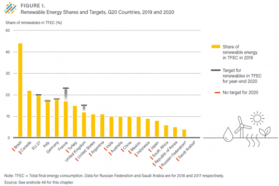 G20再生能源使用比例與目標(圖:REN21, Renewables 2021 Global Status Report)