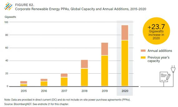 企業透過PPAs採購再生能源的容量成長趨勢(圖:REN21, Renewables 2021 Global Status Report)