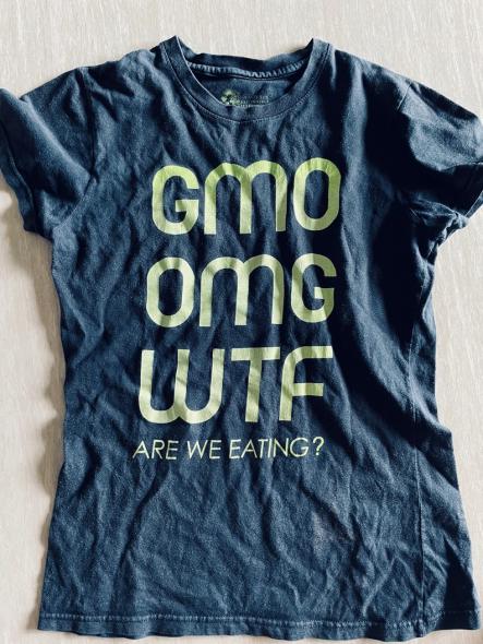 筆者T恤收藏,上面寫著:「GMO我的老天爺,我們到底吃了什麼鬼。」呼應各界對基改食品以及人體影響不明。圖片來源:王迺卉