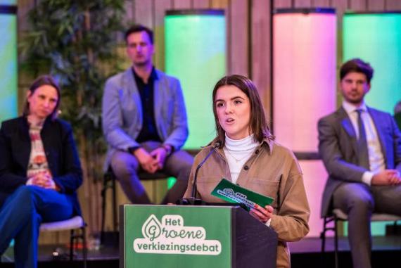 Youth X Naturalis代表Aniek Moonen在辯論會發言。圖片來源:Rafael Martig/Het Groene Election Debate