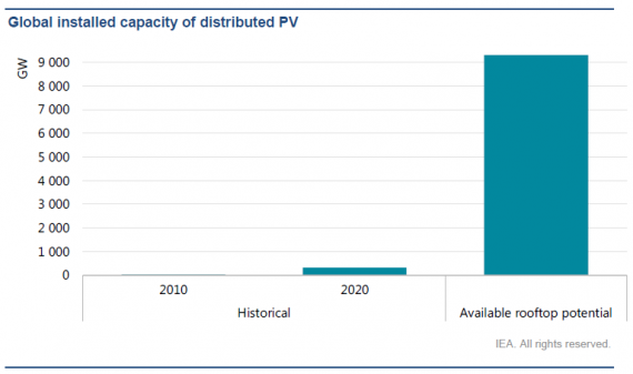 全球屋頂仍有相當多的潛力可安裝太陽能板(來源:IEA)