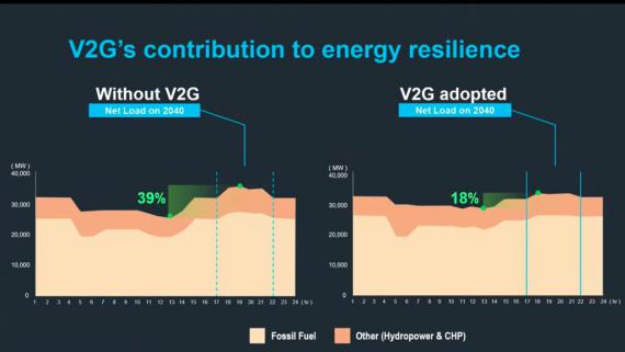 V2G(車輛到電網)創新技術可減少逾一半高峰期用電量,讓電網使用更加彈性。(圖片來源:台達基金會簡報)