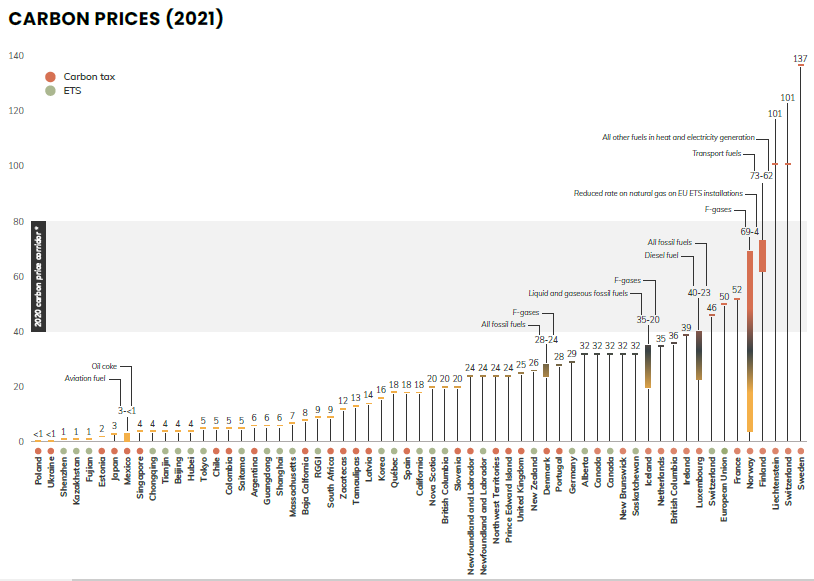 各國碳定價有高有低,台灣要靠向那一邊? (圖片來源:世界銀行《2021碳價趨勢報告》)