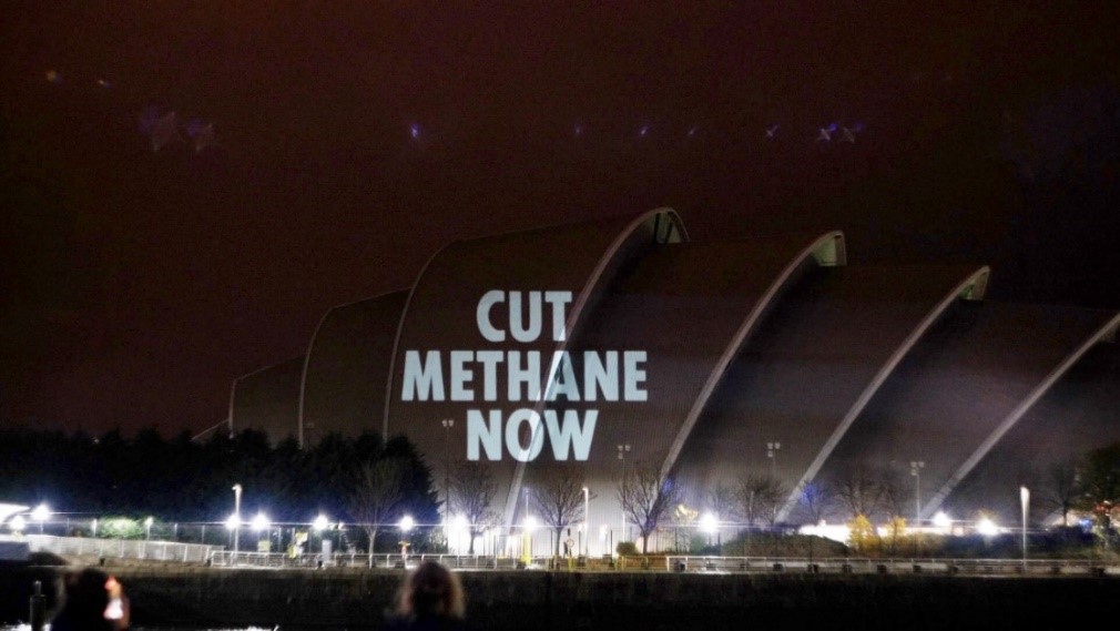 去年COP26會場被環保團體打上「現在就削減甲烷」的標語,成為一時熱聞。 圖片來源:Gastivists Collective (CC BY-NC 2.0)