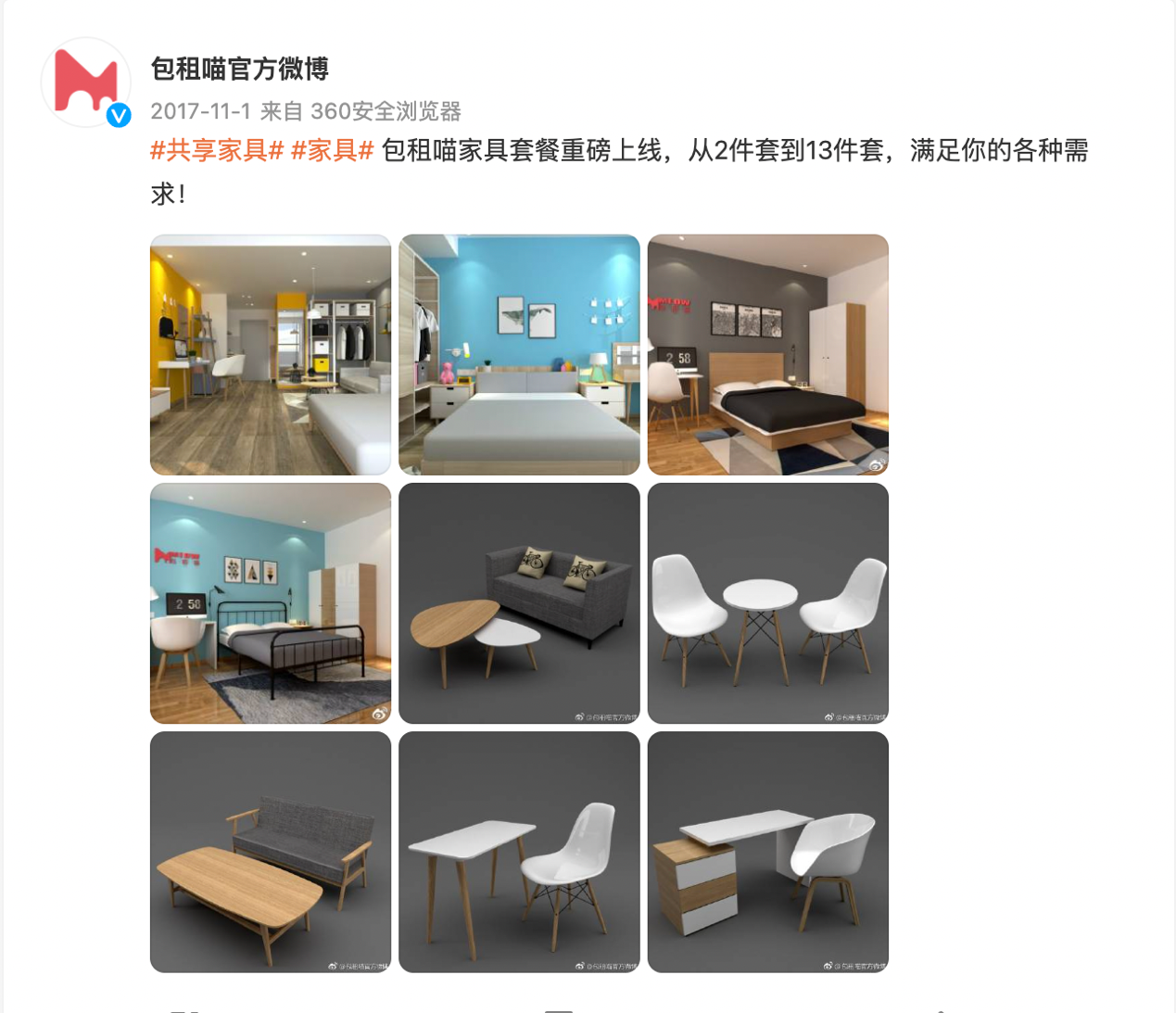 位於中國杭州的「包租喵」,提供了從家具配送、維護、軟裝設計到後續回收的業務。圖片來源:擷取自「包租喵」官方微博
