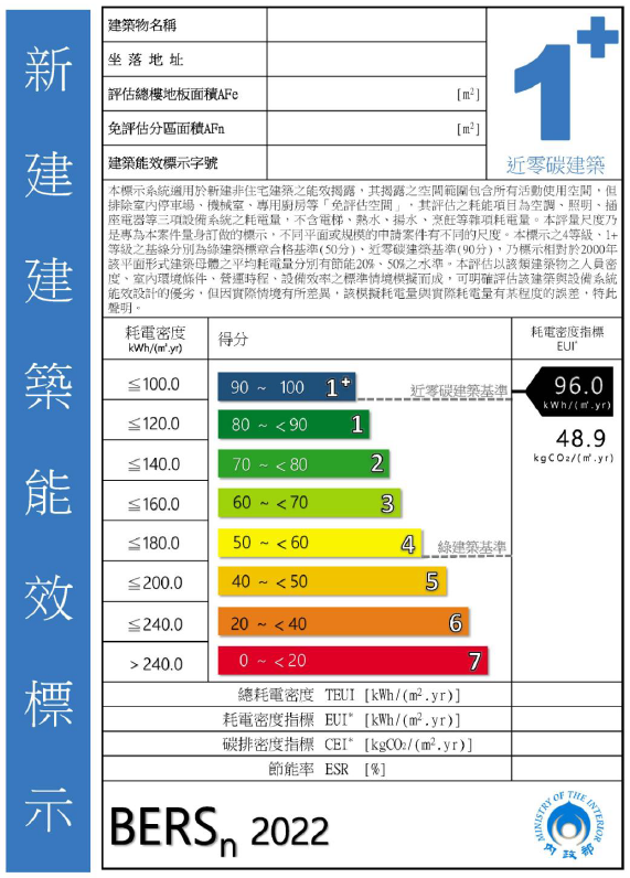 俗稱「建築能源護照」(Energy Performance Certificate)的建築能效評估系統,是內政部因應2050淨零路徑的淨零建築目標,導入歐盟建築能效指令(EPBD)的建築能效標示制度,由建築研究所委託成功大學林憲德教授開發台灣版的 Building Energy-Efficiency Rating System (簡稱BERS),並結合實行多年的「綠建築」標章,在申請綠建築時可一併評估。
