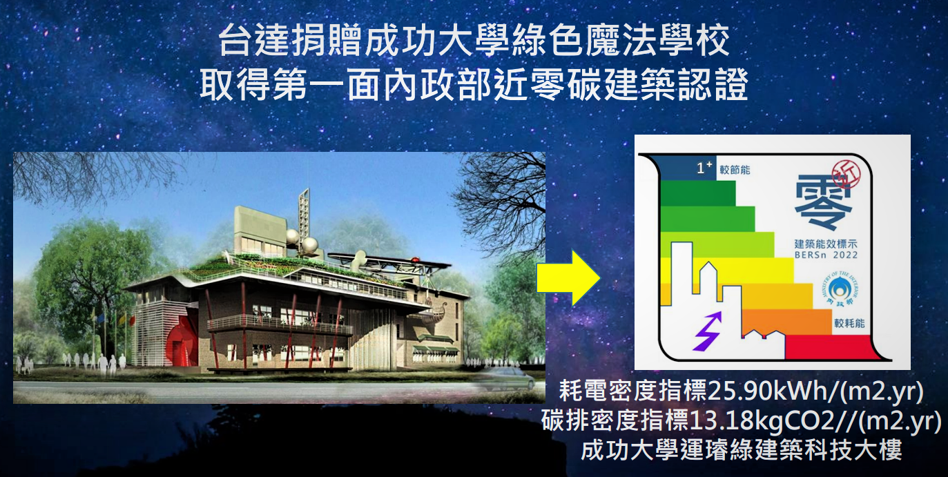 成功大學的孫運璿綠建築研究大樓獲頒全台首張「近零碳建築」(NZCB)等級的能效標示。(來源:林憲德教授簡報)