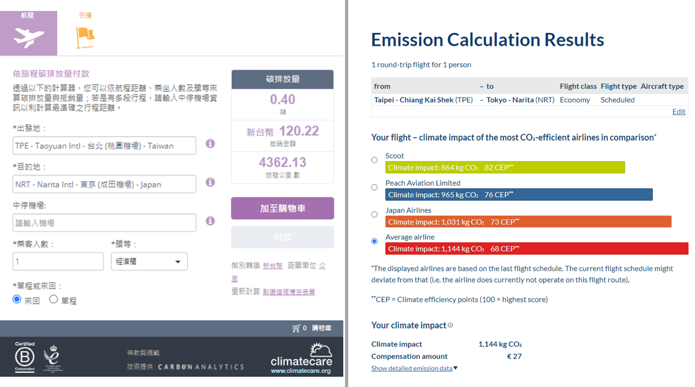 以國人喜愛造訪的日本來說,桃園到東京成田機場來回的航程,在華航網站計算出來的碳排量大約是400公斤,需付出大約新台幣120元的費用來進行碳抵換(檢索日期2022年3月23日);在Atmosfair網站計算出的平均碳排量則是1144公斤,碳抵換費用大約是新台幣850元(27歐元)。