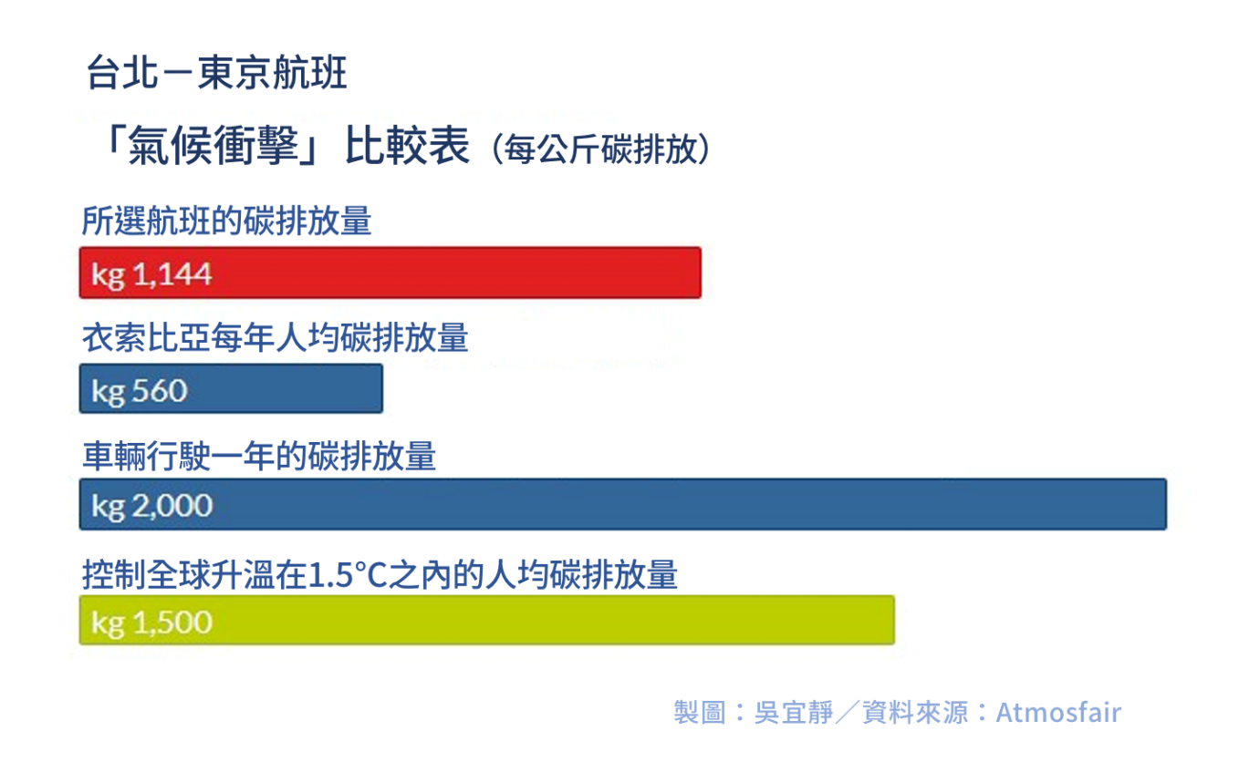 此外,Atmosfair在計算個人飛行碳排的同時,還會顯示該航程的衝擊程度。比如,來回一次桃園東京排碳1144公斤,衣索比亞每人每年平均碳排560公斤,而一輛中型汽車開一年(里程數1萬2000公里)排2000公斤。更重要的是,網站會提醒:若要控制全球升溫在1.5°C之內,每人每年的碳排量應控制在1500公斤。