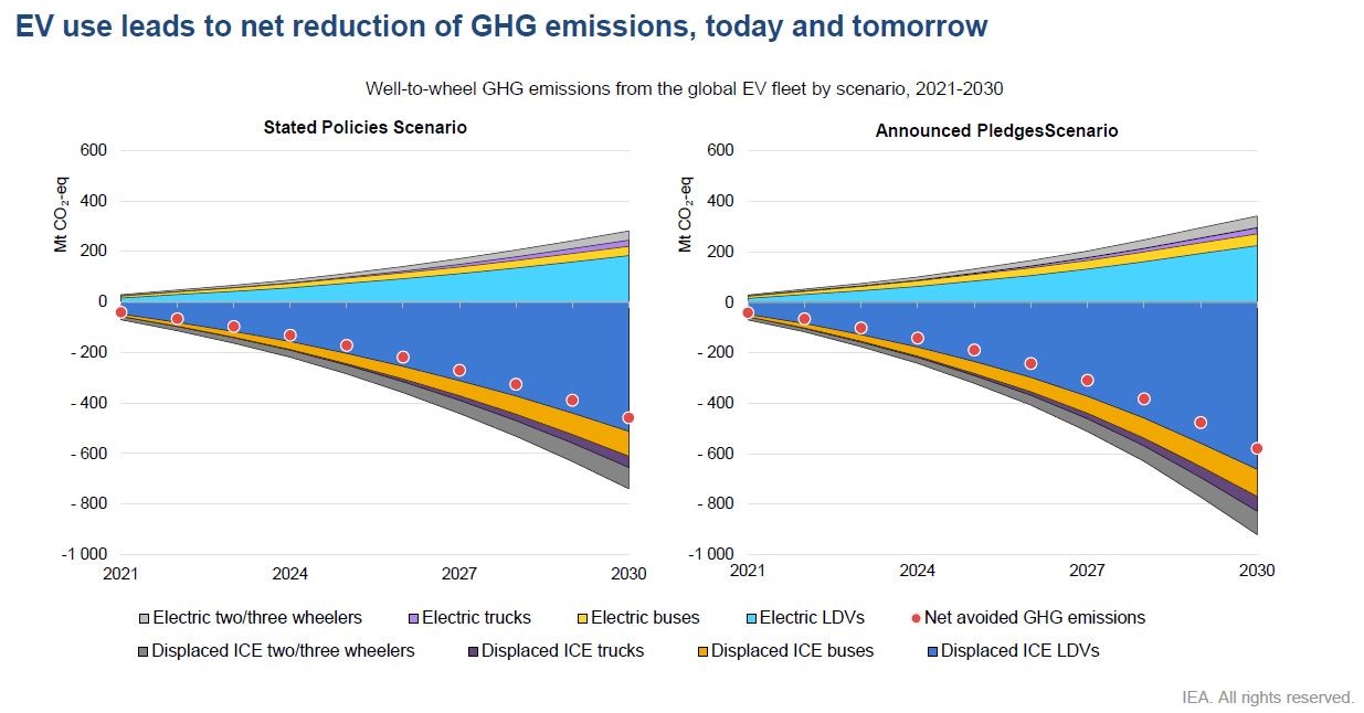 不同情境下,2030年電動車的減碳潛力有些微差距。 (圖源:IEA, 2022 Global EV Outlook)