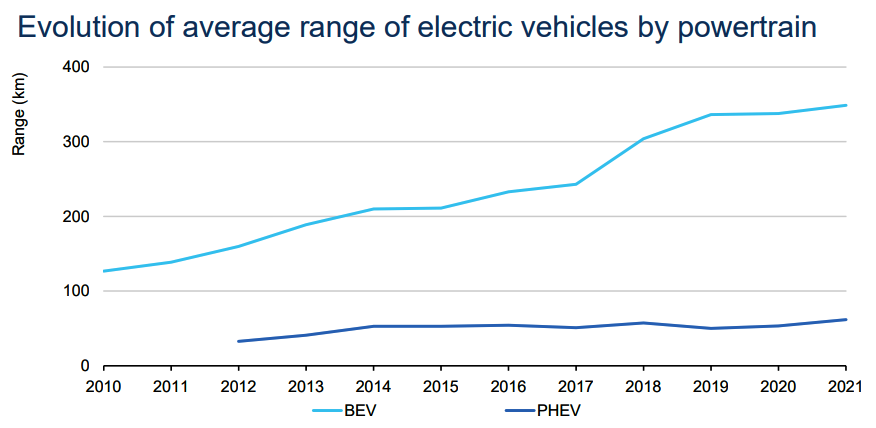 電動車的平均續航力已達350公里,應可滿足日常交通需求。 (圖源:IEA, 2022 Global EV Outlook)