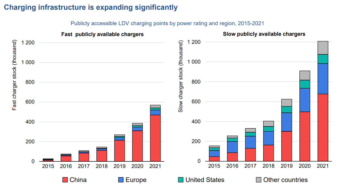各國政府不斷擴增快充(左圖)與慢充(右圖)等公共充電基礎設施。(圖源:IEA, 2022 Global EV Outlook)