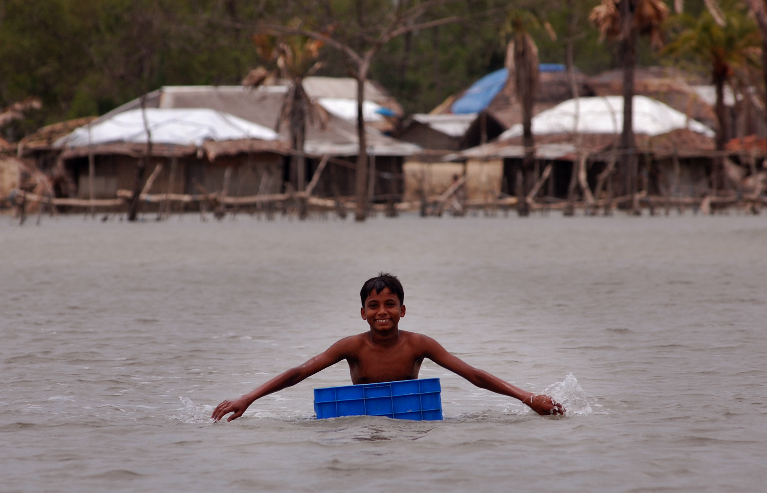 一名位在洪水中的孟加拉小孩,他利用板條箱沿著以往騎腳踏車的路前進。圖片來源:Moneer ul Islam/Oxfam International/Flickr(CC BY-NC-ND 2.0)