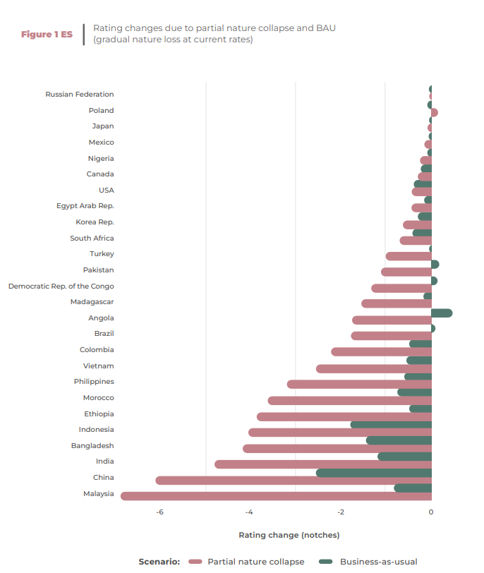 今年六月,英國劍橋大學也開發了一套號稱全球首見、納入生物多樣性指標的主權信用評級制度(Nature Loss and Sovereign Credit Ratings),研究26個國家在不同情境條下的信用評級,倘若生物多樣性按照目前狀態繼續流失,上述國家每年須支付的債務利息將因此激增530億美元,不少國家往後恐面臨資金短缺、債務違約、甚至是破產命運。