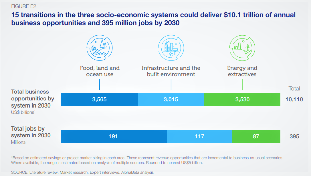世界經濟論壇(WEF)在《自然商業的未來》(The Future Of Nature And Business) 報告就曾表示,光計算:糧食、土地利用、能源、基礎建設等層面,直到2030年,與自然生態有關的經濟模式就可創造近4億個工作機會,還有超過10兆美元的商業價值,值得產業界投入。