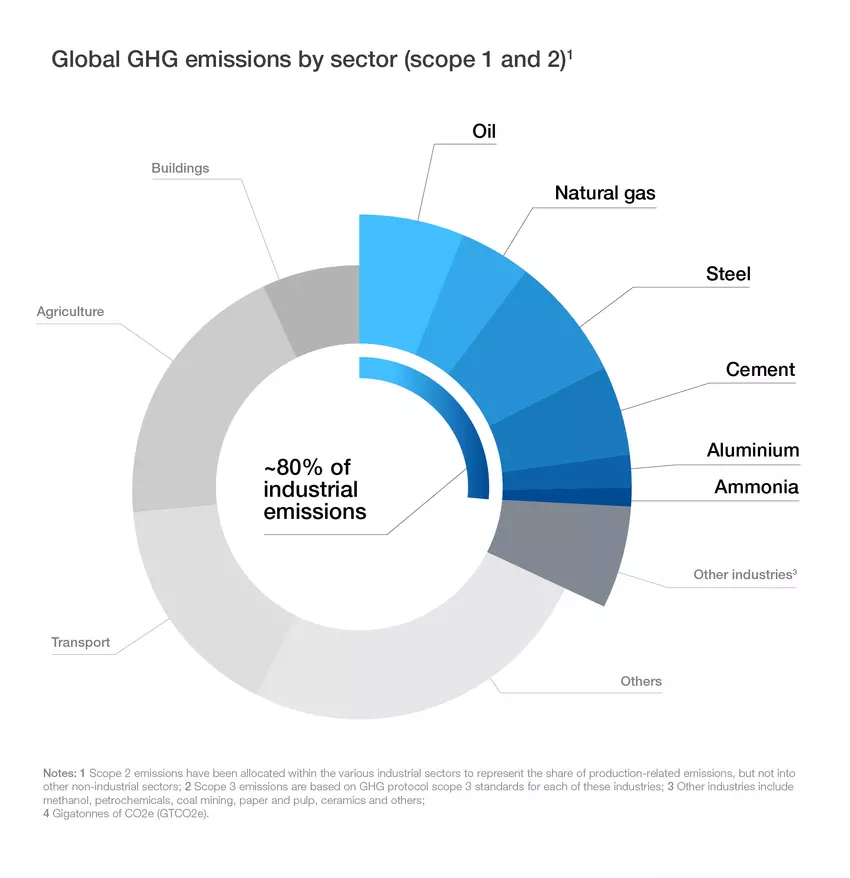 油氣、鋼鐵、水泥等六大重工業,就佔據全球近八成的工業部門排放量。 (圖片來源: WEF)