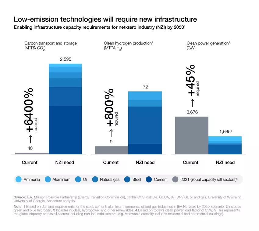 二氧化碳儲存(左)和清潔氫氣(中)等基礎設施,未來都需要數倍的成長幅度。 (圖片來源: WEF)
