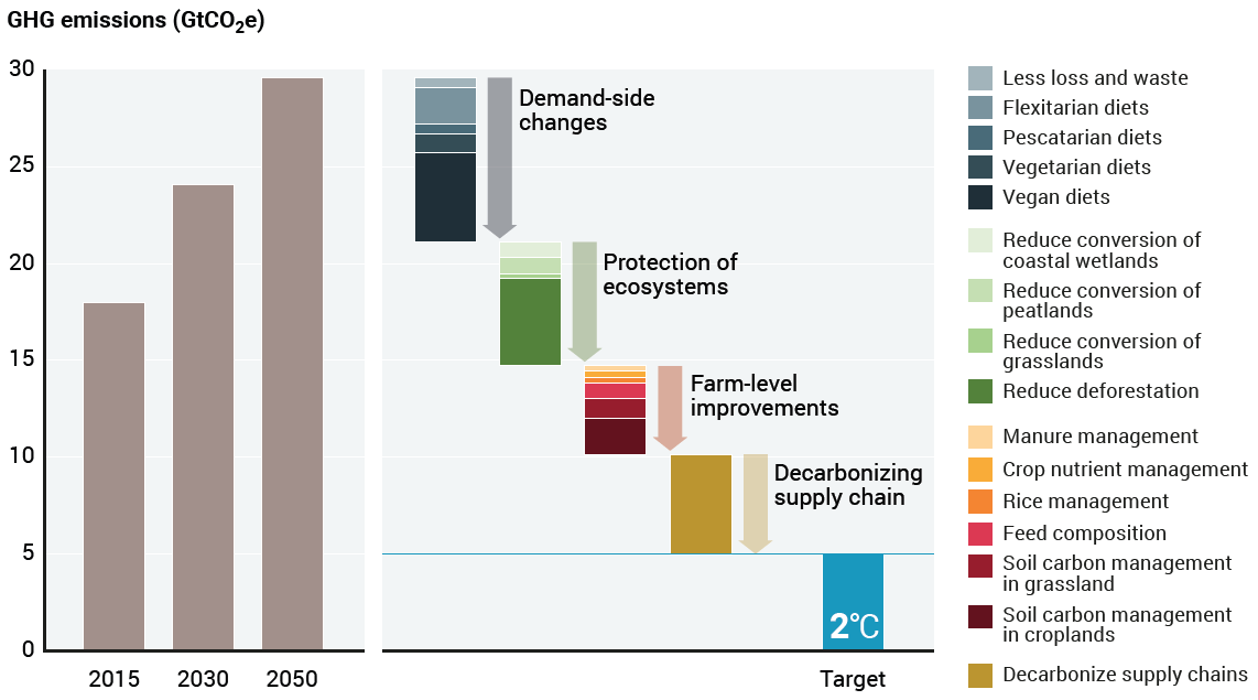 給出的轉型建議則有四項:需求端減碳(減少浪費、朝向素食等)、保護生態系(避免破壞溼地與毀林)、農場改善(如水稻管理、堆肥及土壤碳管理);以及供應鏈減碳。