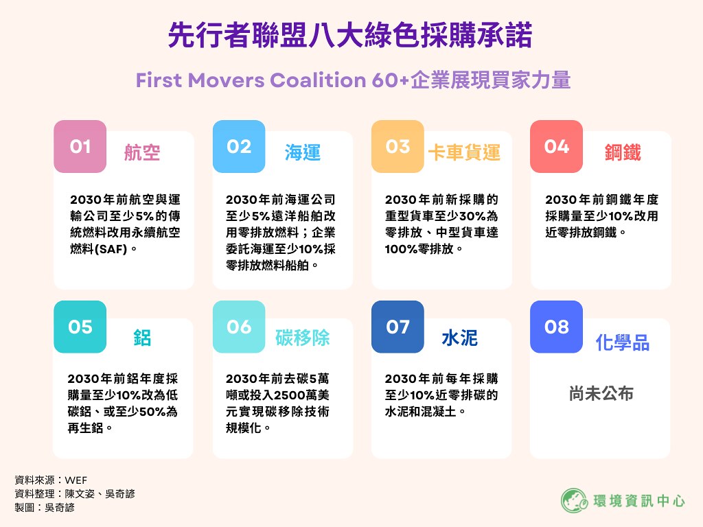 由蘋果、微軟、亞馬遜、波音、空中巴士、富豪集團(Volvo)、船運龍頭馬士基、風電龍頭沃旭等65間知名跨國、跨領域企業所組成的「先行者聯盟」(First Movers Coalition,FMC)8日承諾在2030年前進行120億美元的綠色採購,為創新技術引入投資,讓鋁、鋼鐵、航運、水泥等八大不易減碳的領域,盡速加入脫碳行列。