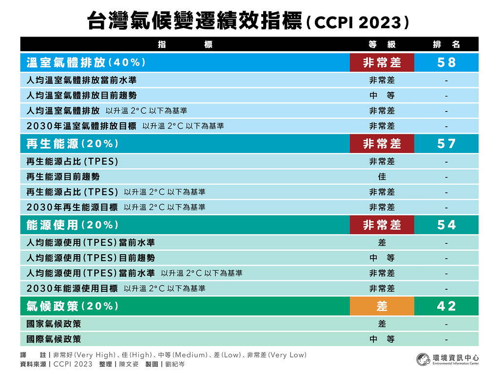 台灣今年上升1名,排在第57位,倒數第7名。去年CCPI引用了錯誤人口數,在年底將台灣排名從60名修正到58名。跟往年一樣,今年依舊未能跳出「非常差」的低段班。