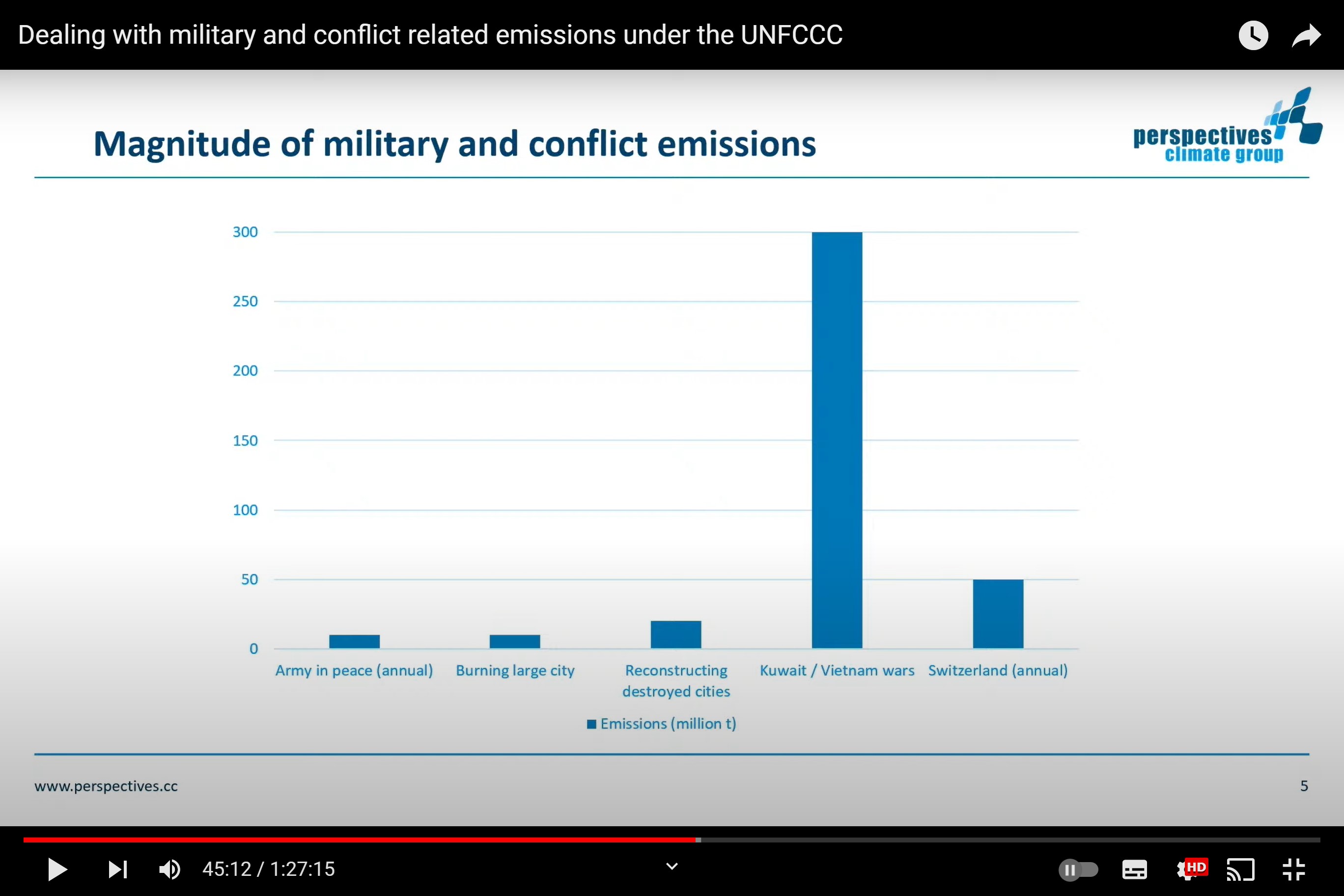雖然缺乏統計方法,Univ. of Zurich and Perspectives Climate Research的講者,仍嘗試從歷史零星資料推算,以1943年二戰時美軍轟炸德國漢堡(漢堡大轟炸[1])為例,半個漢堡市焚毀的碳排為1000萬噸CO2e;1991年波灣戰爭的科威特油田大火,更造成高達4億噸的排放量。