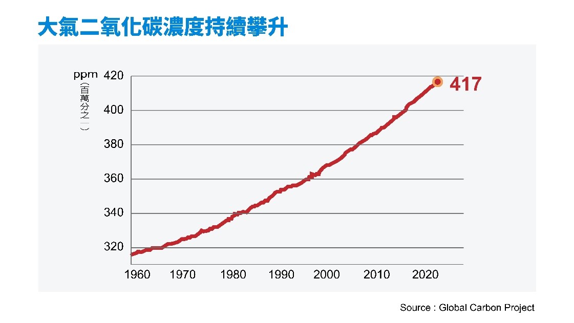 首先,引起氣候變遷的大氣二氧化碳濃度,從工業革命前的277ppm,一路飆升到2022年的417.2ppm,成長幅度已經超過50%,顯示這些年的減碳努力似乎還沒看到效果。