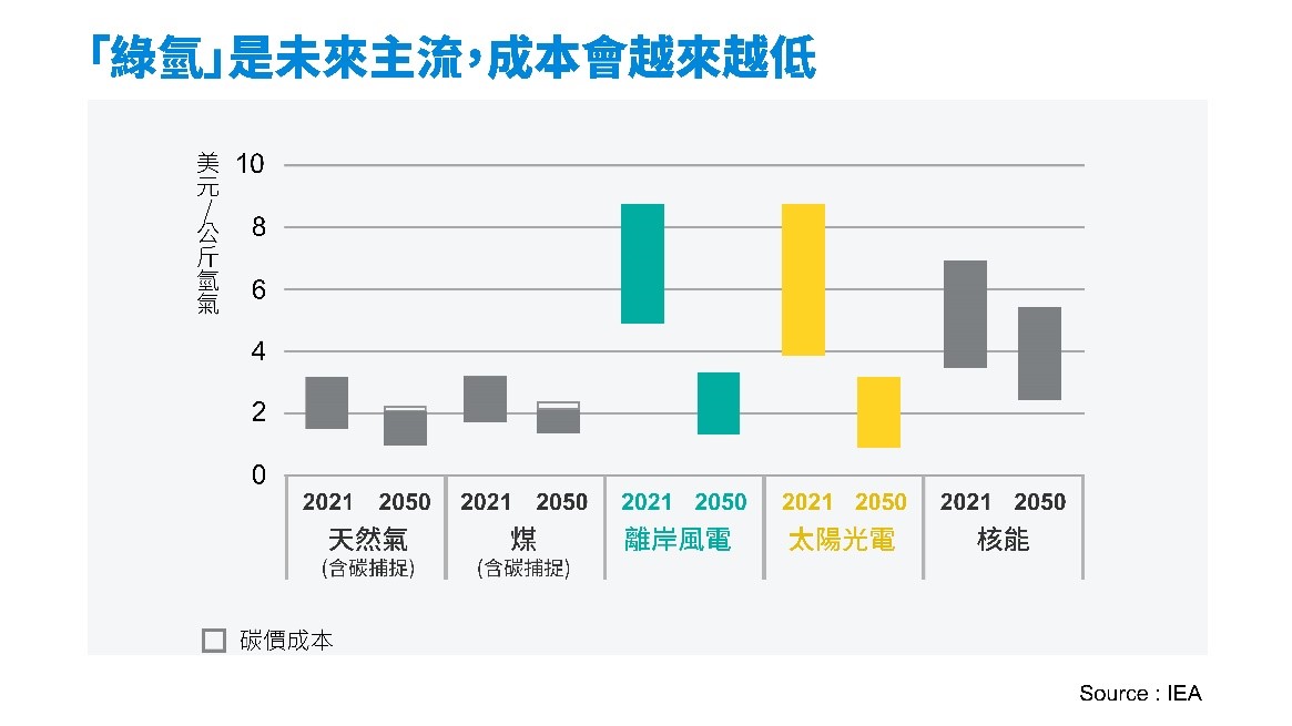 國際能源總署(IEA)預估到了2030年,綠氫每公斤成本有機會降至1.3~4.5美元(台幣42~145元),足以和化石燃料產製的「灰氫」匹敵。