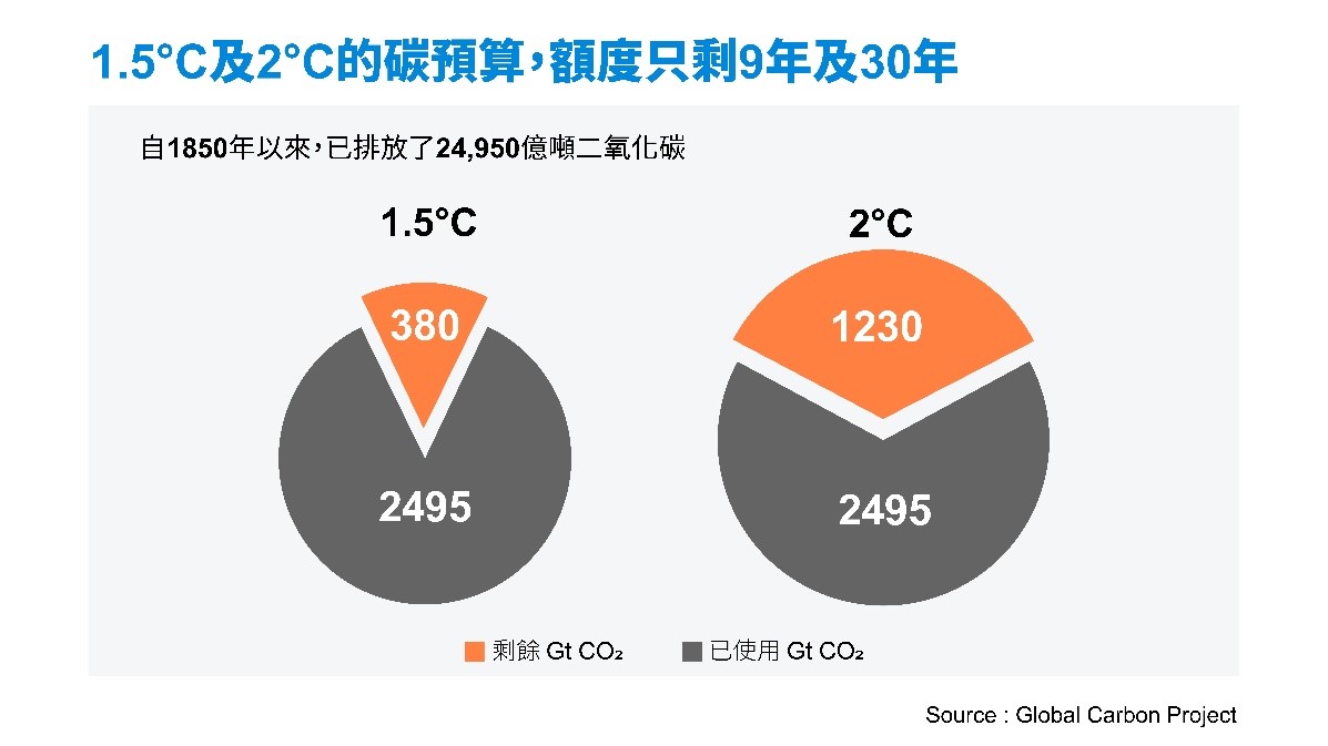 今後,如果人類要將地球升溫幅度限制在攝氏1.5度和2度內,僅存的碳預算分別只有3800億噸和1兆2300億噸,以目前每年排放規模來算,我們大概只剩9年和30年的時間,可以扭轉局勢。