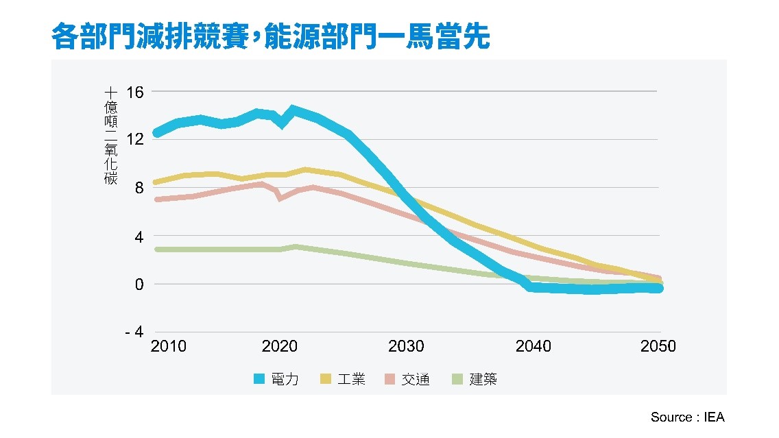 國際能源署(IEA)最新發布的《世界能源展望》(WEO 2022) 報告,畫出了各部門未來可能的淨零路徑,電力部門(藍色)的下降趨勢最為明顯,減碳步伐較工業、交通、建築等部門更為順利,可能因該部門多由政府及公部門掌控有關。