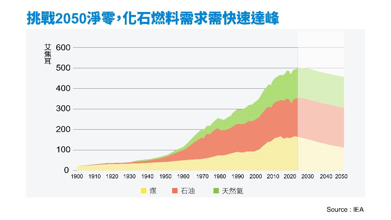 IEA預估,在現行政策情境下,天然氣需求會在本世紀末達到穩定,而隨著電動車銷量攀升,意味著石油需求將在2030年代中期趨於平穩,然後便開始下降。全球與能源相關的二氧化碳排放量,將在2025年左右達到最高點,讓人類逐漸擺脫化石燃料依賴症。