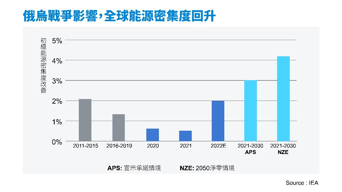 俄烏戰爭開打,引發國際能源價格飆漲,在許多國家爆發通膨危機。前幾年跌至谷底的能源效率,因此重獲矚目。IEA年底更新的《2022能源效率報告》發現,全球能源密集度在2022年成長率翻倍至2%,比2016~19年老在1%徘迴的情況大為改善。
