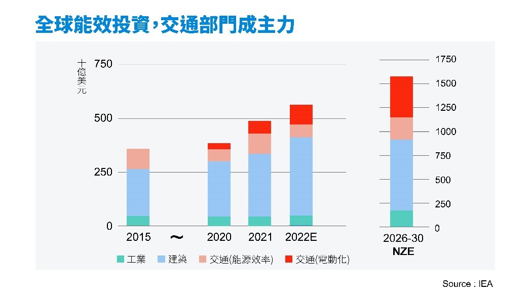 《2022能源效率報告》同時指出,相較於2021年,全球能源效率投資金額在2022年大幅成長16%、來到5600億美元的新高。以交通部門(紅色)的成長最為明顯,光是「運具電動化」相關計畫的投資,就多達900億美元。