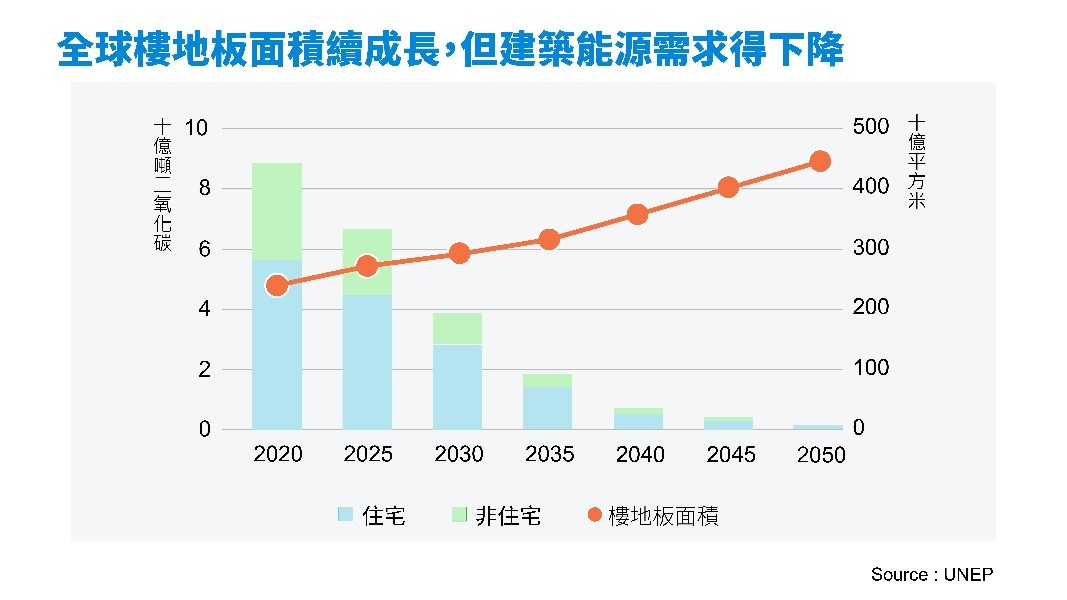 聯合國環境規劃署(UNEP)發布的《全球建築和施工現狀報告》分析,因開發中國家需求旺盛,今後全球建築樓地板面積(紅點)仍會持續增加,但因再生能源、電氣化與其他減碳技術的加持,該部門碳排可望快速下降。