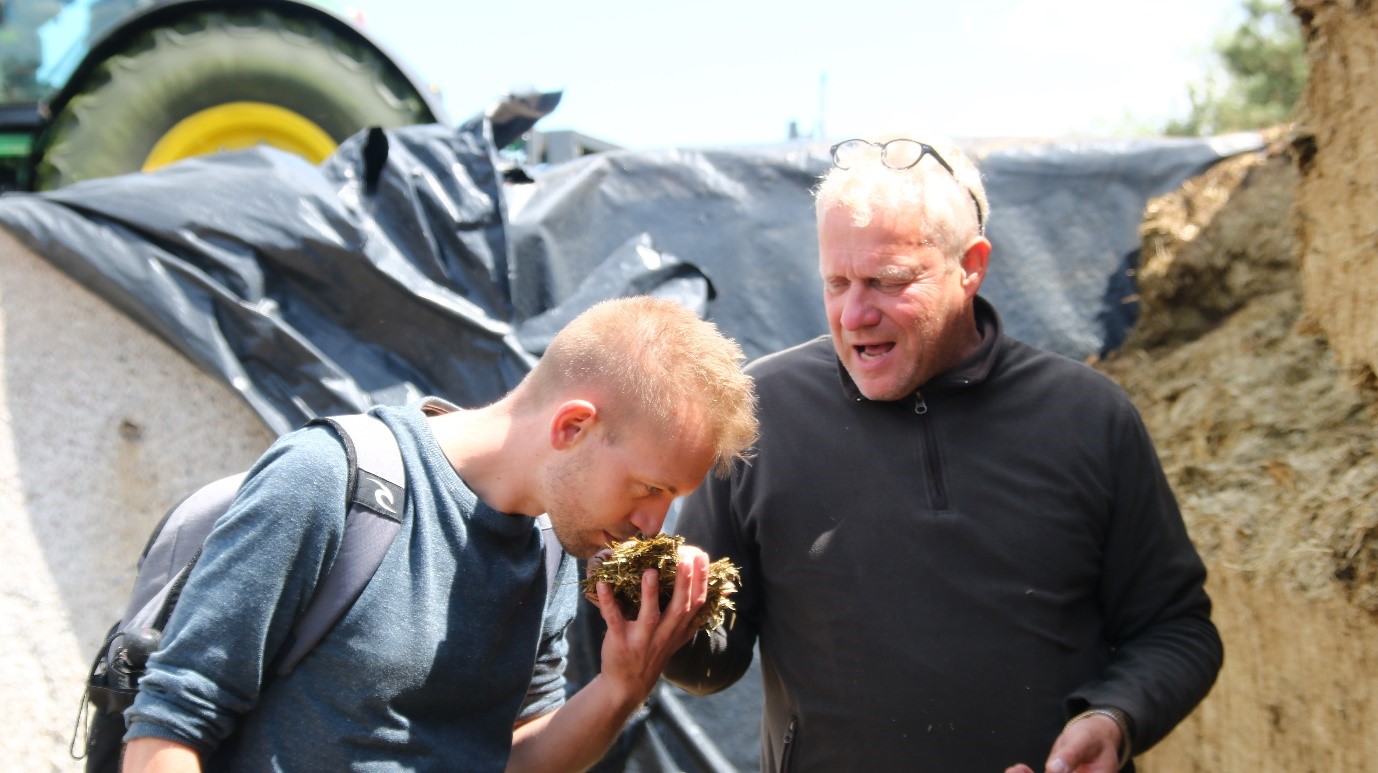 主責沼氣發電工作的Markus Rüter(右)拿牧草給翻譯夥伴Tobias Sauer(左)聞乾燥的牧草,感受牧草的清香,且沒有異味。圖片來源:陳郁玲 攝